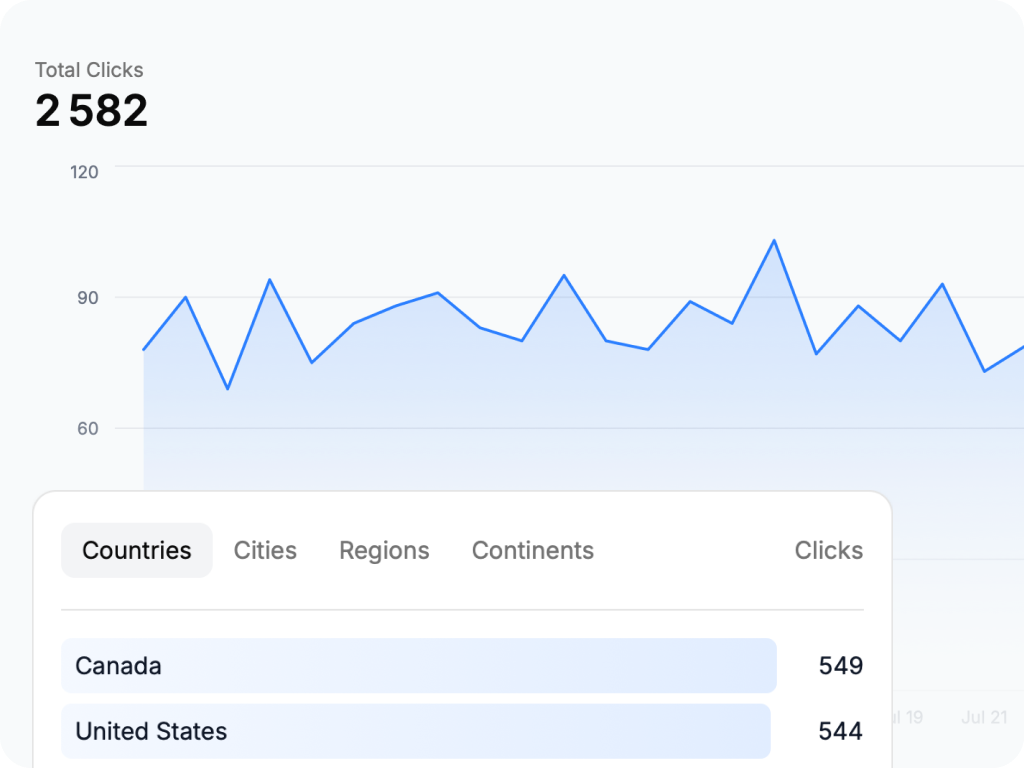 Understand your audience with detailed insights. Track clicks, devices, locations, and browsers — visualized beautifully in real time.