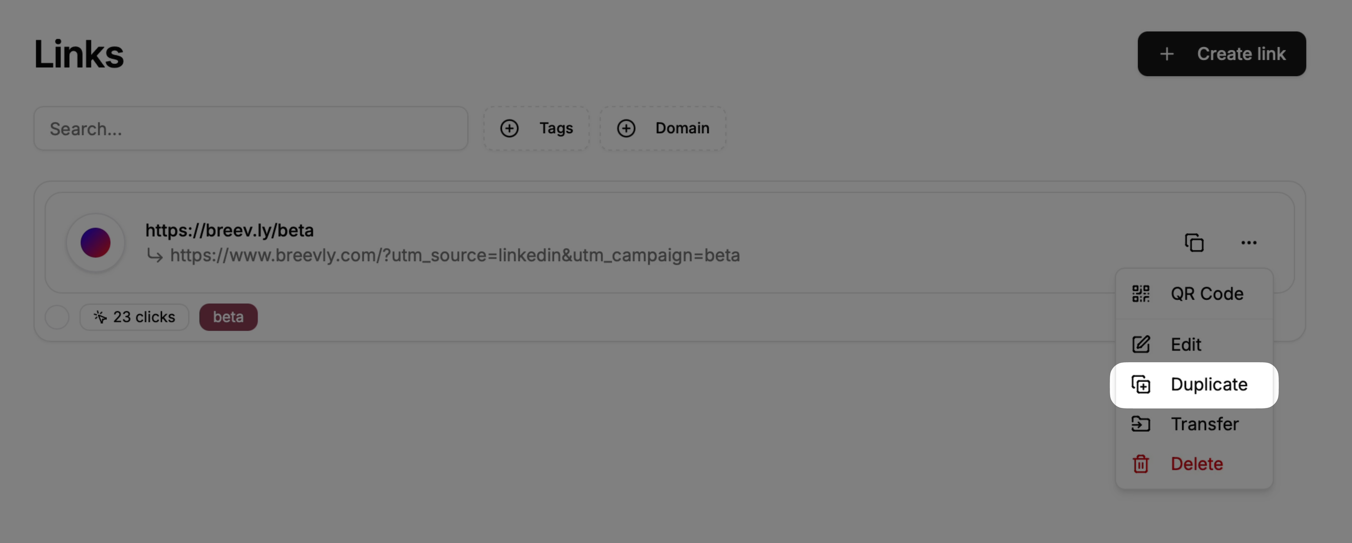 You can easily duplicate any link in your workspace to create a copy with the same settings.