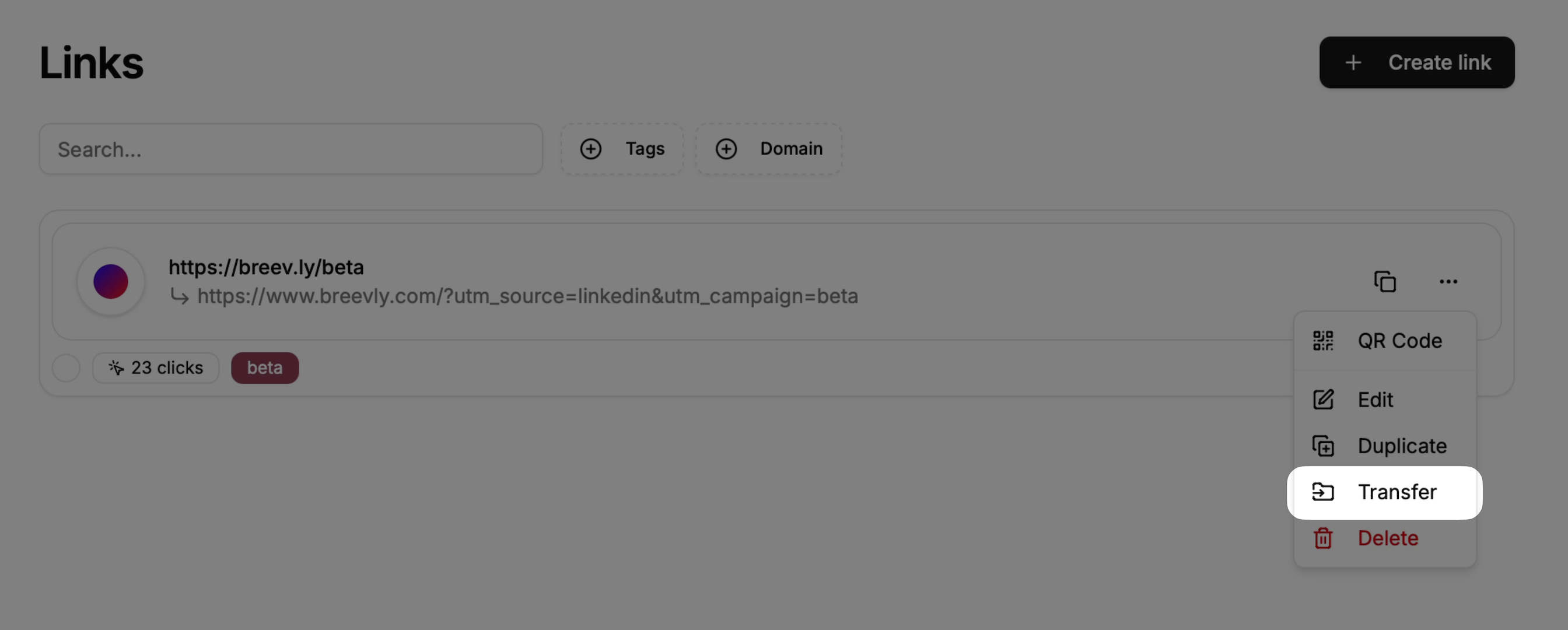 Click on the more options button () available at the right side of your link row, and press on Transfer